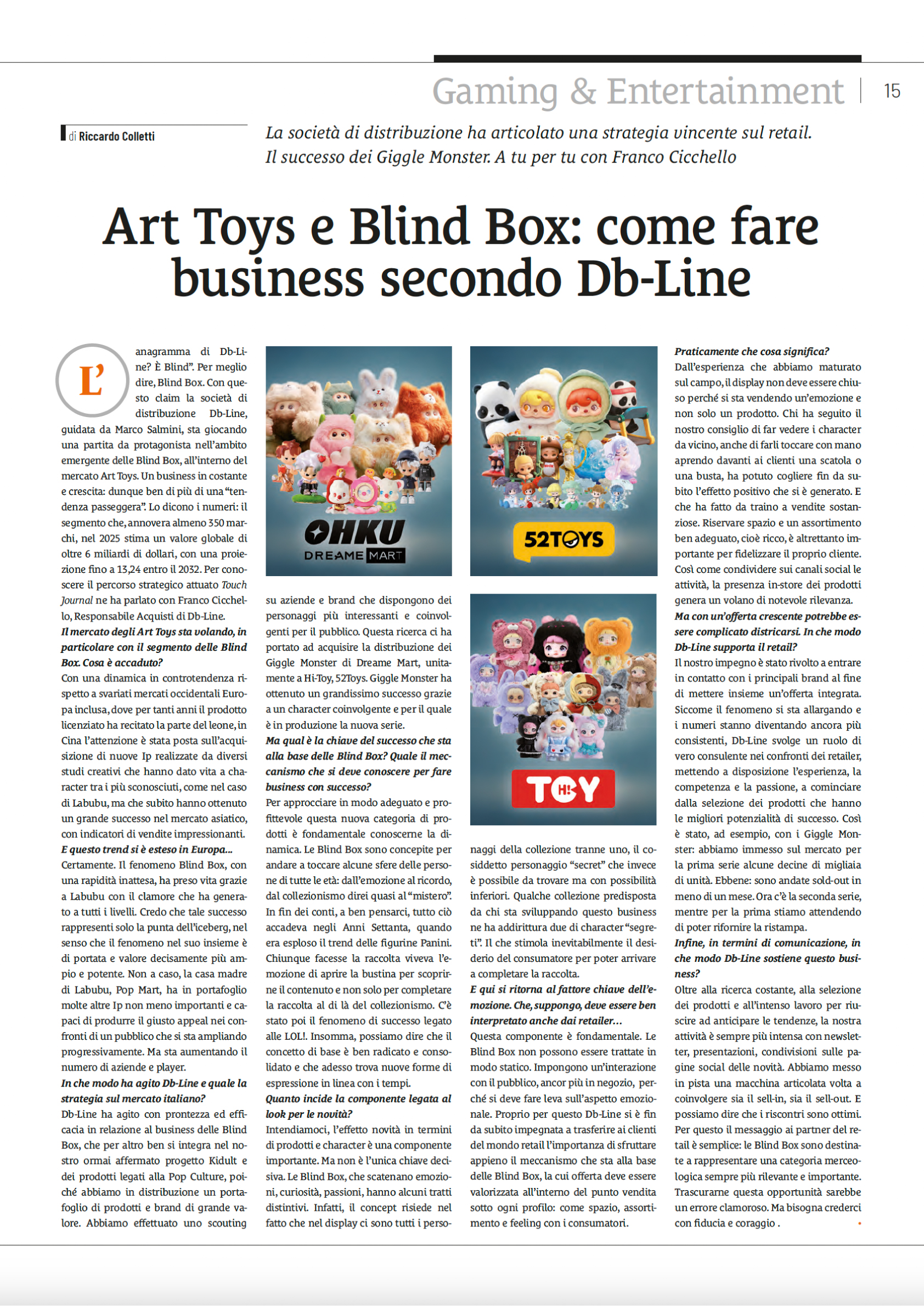 Sulla rivista Touch Journal, nell’intervista con il Responsabile Acquisti Franco Chicchello, Db-Line spiega il fenomeno Blind Box e le strategie da attuare per sviluppare con successo il business: un’offerta ricca, ampia e ben assortita da dislocare nei punti vendita con massima visibilità per coinvolgere ed emozionare i consumatori.
