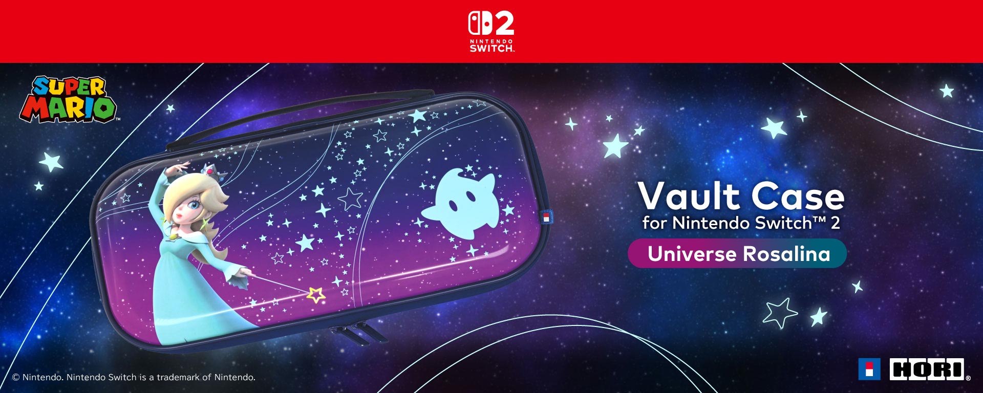 Per trasportare agevolmente la propria Nintendo Switch 2 e gli accessori la custodia Vault Case è la novità targata HORI (versione Universe Rosalina). L’esterno è impreziosito da una grafica di Rosalina dai colori vividi, mentre l’interno, con morbida fodera decorata con Rosalina e Luma, protegge la console da graffi e segni di usura, così puoi giocare ovunque in totale tranquillità. La struttura interna appositamente progettata mantiene Nintendo Switch 2 perfettamente stabile. Il pratico lembo interno protegge lo schermo e offre spazio per fino a 10 schede di gioco, mentre la tasca in rete tiene ordinati e al sicuro i piccoli accessori.